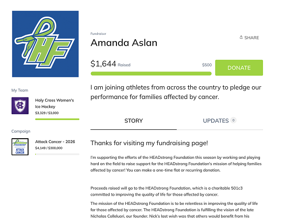 Whether it’s an in-season dedication game, out-of-season play days, team or individual pledging, the Attack Cancer campaign is open to athlete participants year-round for fundraising and awareness opportunities that serve the HEADstrong mission. Click the image to sign up today!